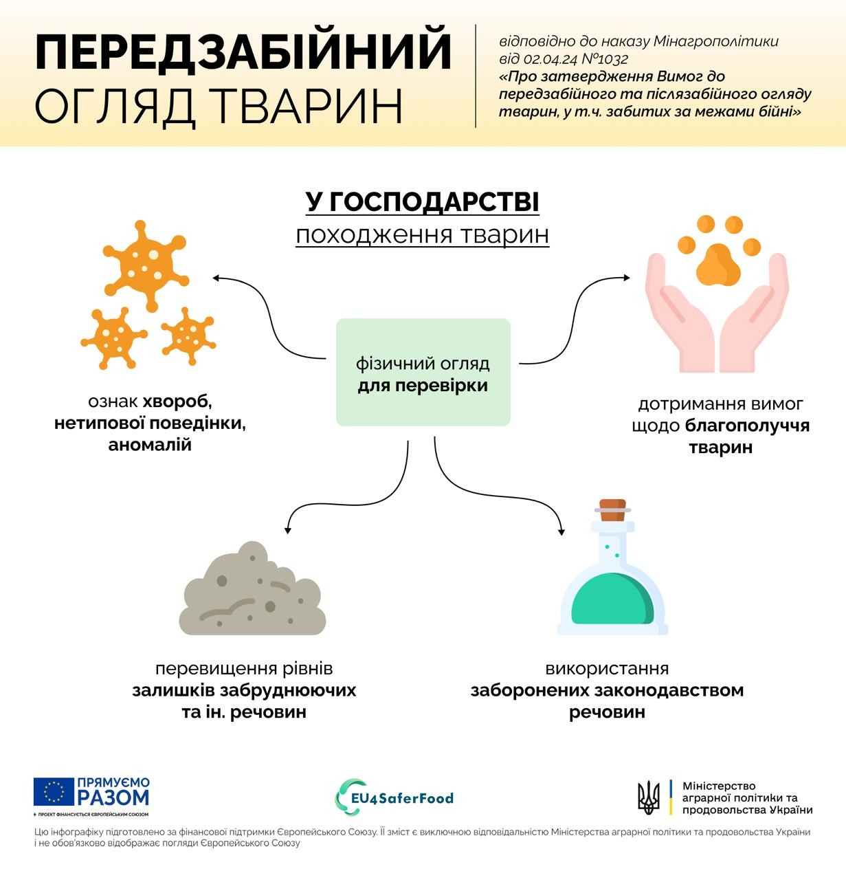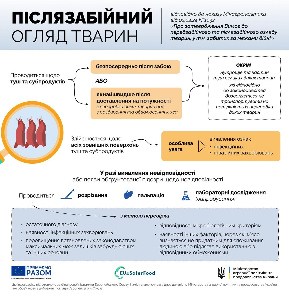 наказ Міністерства аграрної політики та продовольства України від 02.04.2024 № 1032 "Про затвердження Вимог до передзабійного та післязабійного огляду тварин, у тому числі забитих за межами бійні"