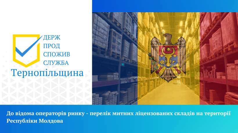 Головне управління Держпродспоживслужби в Тернопільській області інформує, що компетентним органом Республіки Молдова доведено до відома перелік митних ліцензованих складів на території Республіки Молдова, де можливе зберігання продуктів тваринного походження, харчових продуктів нетваринного походження, кормів до моменту отримання результатів лабораторних досліджень при проходженні контролю у пунктах пропуску на кордоні із Молдовою.