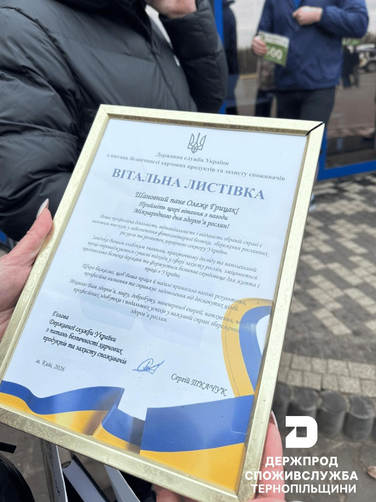 Також у межах заходу заступник начальника Головного управління Держпродспоживслужби в Тернопільській області передала вітальну листівку від імені Голови Державної служби України з питань безпечності харчових продуктів та захисту споживачів Сергій Ткачук Олегу Грицаку з нагоди Міжнародного дня здоров’я рослин.