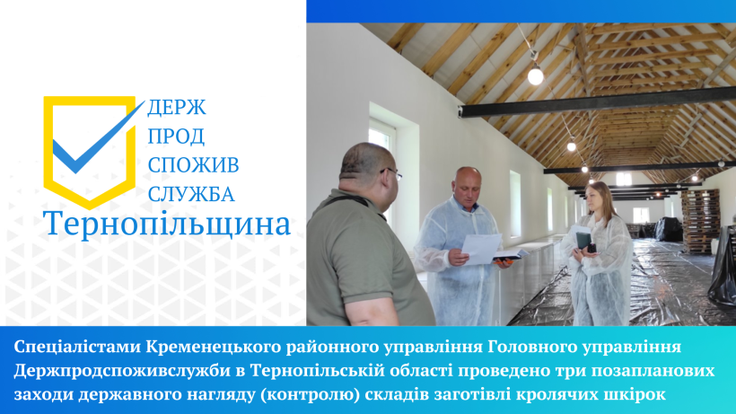 Спеціалістами Кременецького районного управління Головного управління Держпродспоживслужби в Тернопільській області проведено три позапланових заходи державного нагляду (контролю) складів заготівлі кролячих шкірок на предмет дотримання вимог законодавства у сфері ветеринарної медицини з метою видачі експлуатаційних дозволів.